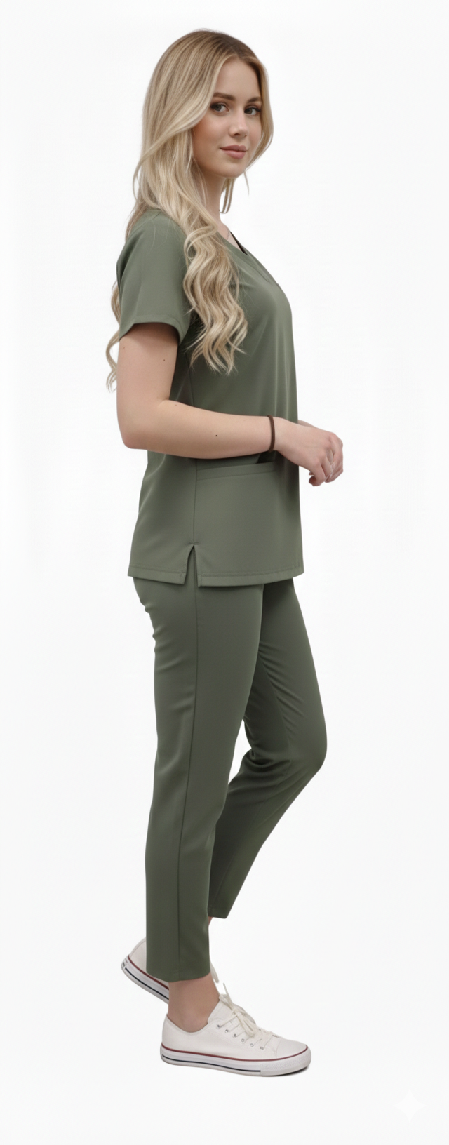 Opcja A: Cygaretki PREMIUM (Klasyczna elegancja) Dopasowany krój ze zwężanymi nogawkami i subtelnymi rozporkami u dołu. Idealne dla pań ceniących profesjonalny, biurowy sznyt w wydaniu medycznym. Posiadają dwie kieszenie z przodu.