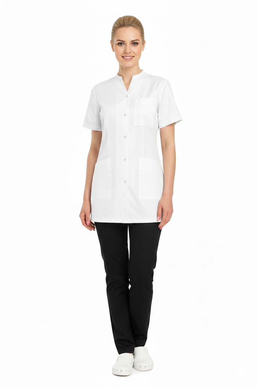 • Wygoda i dynamika: Dekolt w kształcie litery „V” (serek) oraz optymalna długość (76–81 cm) gwarantują komfort nawet podczas najbardziej intensywnych dyżurów czy zabiegów.